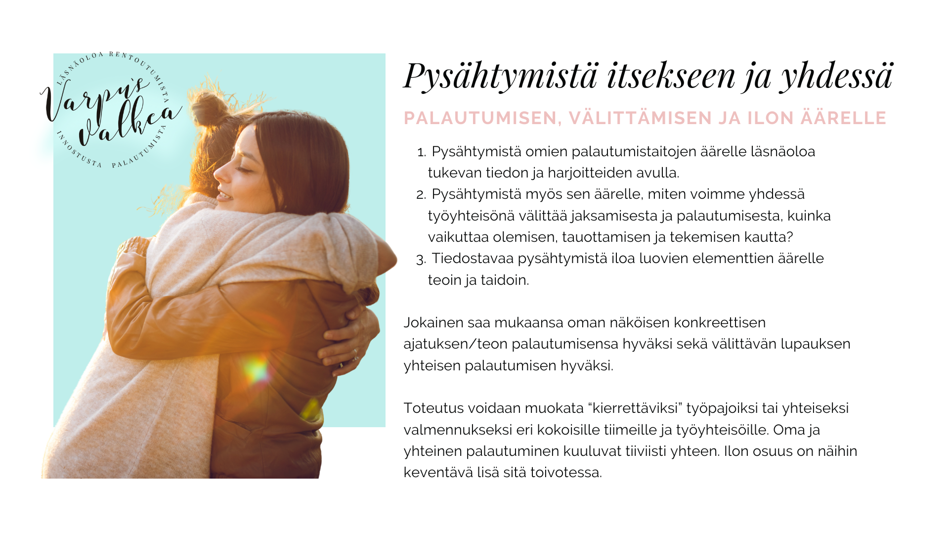 Autan työyhteisöjä rakentamaan välittävää ja inhimillisempää työkulttuuria, jossa on tilaa palautua, voida paremmin ja onnistua yhdessä. Hyvinvointi ei synny yksittäisistä teoista, vaan arjessa koetusta osallisuudesta, kuulluksi tulemisesta ja siitä, että ihminen saa olla ihminen myös työssä.